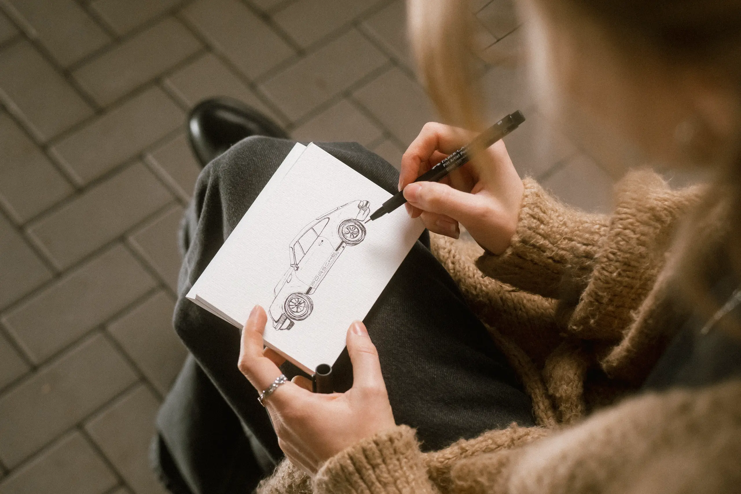 Mit dem Fineliner, mit Tusche oder ein wenig Aquarell lassen sich feine, leichte Skizzen erschaffen – ganz intuitiv. Diese Art zu zeichnen begleitet mich oft – zuhause auf kleinem Format, unterwegs im Skizzenbuch oder direkt auf der Straße beim Urban Sketching. Ob im Café, im Automuseum oder einfach mitten im Alltag: Es braucht nicht viel. Ein Stift, ein Blatt Papier und ein Moment reichen aus. Diese Technik erlaubt mir, spontan zu arbeiten, ohne großen Aufwand, aber mit Gefühl. Ich mag diese Leichtigkeit – sie gibt mir Freiheit und passt zu dem, was ich ausdrücken möchte.